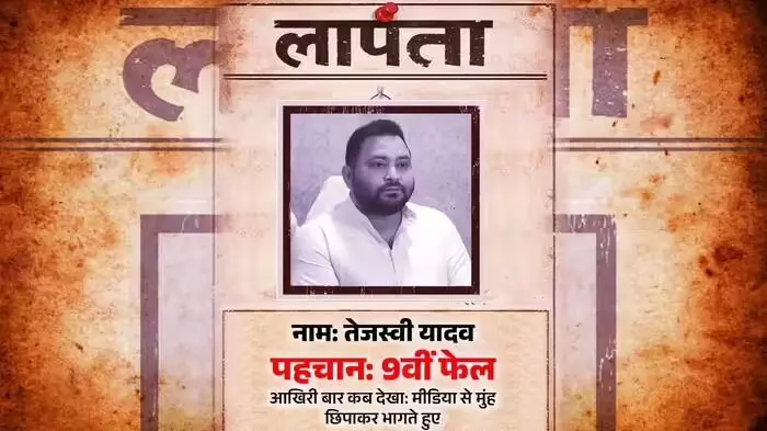 बिहार बीजेपी ने तेजस्वी यादव के 'गायब' रहने को लेकर तंज कसा है। बीजेपी ने पोस्टर जारी कर तेजस्वी यादव को लापता घोषित किया है। बिहार बीजेपी ने सोशल मीडिया पर आज यानी बुधवार को जारी पोस्टर के साथ केप्शन लिखा है, लापता की तलाश! नाम- तेजस्वी यादव, पहचान-9वीं फेल, आखिरी बार कब देखा- मीडिया से मुंह छुपाकर भागते हुए।