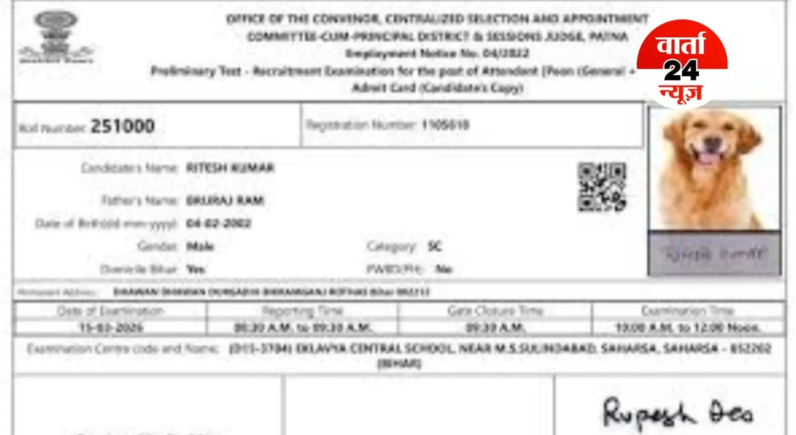 पटना। बिहार के रोहतास जिले से एक अजीबोगरीब खबर आई है। दरअसल यहां एक अभ्यर्थी के एडमिट कार्ड में उसकी तस्वीर की जगह कुत्ते की तस्वीर लगी हुई थी। इस घटना से अभ्यर्थी परेशान हैं। इस घटना से भर्ती प्रक्रिया पर एक बार फिर से सवाल खड़ा होता है। जानकारी के मुताबिक, यह घटना बिक्रमगंज थाना क्षेत्र के धवा गांव की है। दरअसल धवा गांव के निवासी रितेश कुमार ने 2022 में सिविल कोर्ट में चपरासी के पद के लिए आवेदन किया था। लेकिन इतने लंबे अंतराल पर जब परीक्षा के लिए एडमिट कार्ड जारी किया गया, तो होश अभ्यर्थी रितेश का होश उड़ गया।