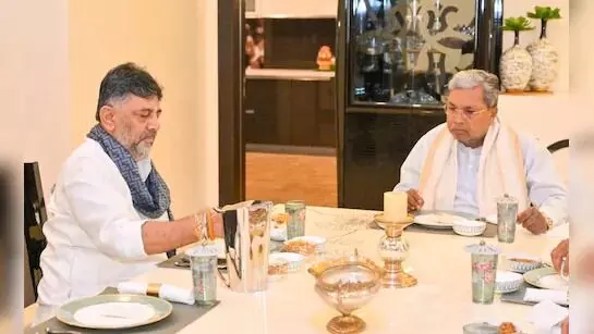 बेंगलुरू। कर्नाटक की राजनीति में अलग ही सियासत चल रही है। एक बार फिर अंदरूनी खींचतान एक बार फिर चर्चा में है। बता दें कि सत्ता साझा करने को लेकर उठ रहे सवालों के बीच मुख्यमंत्री सिद्धारमैया और उपमुख्यमंत्री डी.के. शिवकुमार की मुलाकात नाश्ते की मेज पर हो रही है। यह मुलाकात आज को शिवकुमार के घर हो रही है। जिसके लिए सीएम सिद्धारमैया उपमुख्यमंत्री डी.के. शिवकुमार के घर पहुंचे हैं।