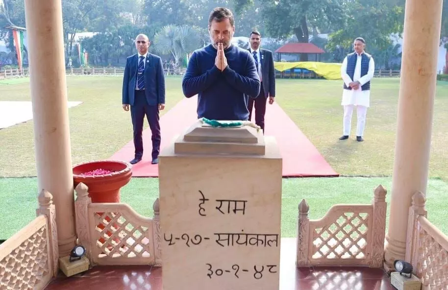 नई दिल्ली। लोकसभा में विपक्ष के नेता राहुल गांधी ने आज महात्मा गांधी की 78वीं पुण्यतिथि (शहीद दिवस) के अवसर पर दिल्ली के तीस जनवरी मार्ग स्थित गांधी स्मृति पहुंचकर उन्हें भावभीनी श्रद्धांजलि अर्पित की। इस अवसर पर उनके साथ कांग्रेस अध्यक्ष मल्लिकार्जुन खरगे और पार्टी के अन्य वरिष्ठ नेता भी मौजूद थे। राहुल गांधी ने महात्मा गांधी को याद करते हुए उन्हें "भारत की आत्मा" बताया और कहा कि उनके विचार अमर हैं, जिन्हें कोई शक्ति मिटा नहीं सकती।