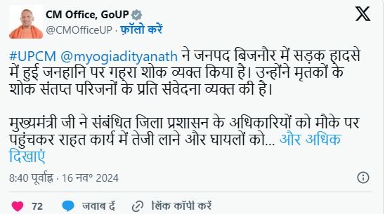 बिजनौर। उत्तर प्रदेश में कोहरे के कारण सड़क दुर्घटना की संख्या बढ़ने लगी है। आज तड़के बिजनौर में एक कार ने ऑटो को टक्कर मार दी। इस घटना में दूल्हा-दुल्हन समेत सात लोगों की मौत हो गई। सीएम योगी ने इस घटना पर दुख जताते हुए स्थानीय प्रशासन को घायलों को समुचित इलाज देने के निर्देश दिए हैं।