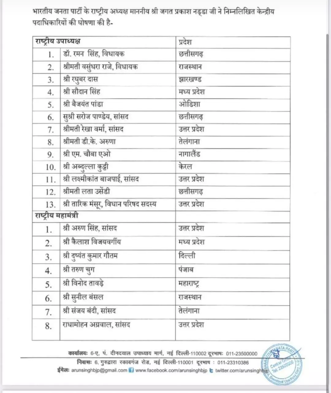 लक्ष्मी कांत बाजपेयी लक्ष्मीकांत बाजपेयी राष्ट्रीय उपाध्यक्ष बनाये गये, अरुण सिंह अरुण सिंह एक बार पुनः राष्ट्रीय महासचिव बनाए गए ।AMU के पूर्व VC और MLC तारिक मंसूर राष्ट्रीय उपाध्यक्ष बनाये गए ।