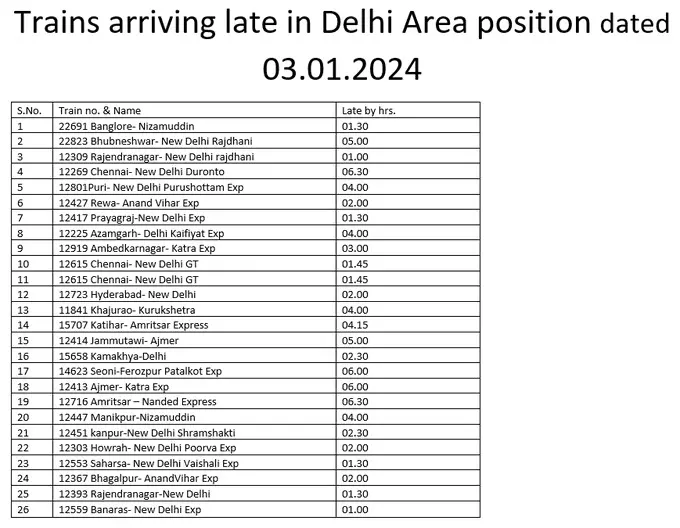 भारतीय रेल प्रशासन की ओर से लेट ट्रेनों की एक सूची जारी की गई है. इस लिस्ट के हिसाब से ट्रेनें 1 घंटे से लेकर 8 घंटे तक की देरी से चल रही हैं. बता दें कि दिल्ली एनसीआर सहित नॉर्थ इंडिया के अधिकांश इलाकों में मंगलवार की सुबह भी घना कोहरा छाया रहा. मौसम विभाग के हिसाब से दिल्ली और इसके आसपास के इलाकों में शीतलहर और कोहरे का ये प्रकोप 7 जनवरी 2024 तक जारी रहेगा. कोहरे में लो विजिबिलिटी के कारण यातायात व्यवस्था भी प्रभावित होती है. ऐसे में यात्रियों को अभी कुछ दिन और परेशानी झेलनी पड़ेगी.