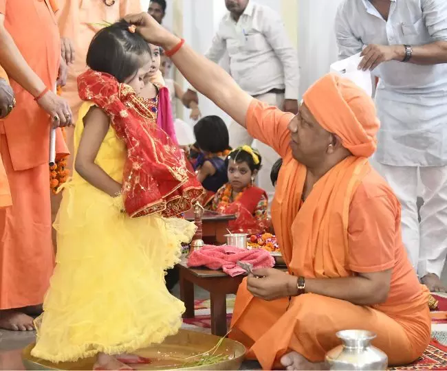 मुख्यमंत्री एवं गोरक्षपीठाधीश्वर योगी आदित्यनाथ ने मंदिर के भोजनालय में पीतल के बर्तन में भरे जल में नौ नन्ही बालिकाओं के बारी-बारी पांव धोए। दुर्गा सप्तशती के मंत्रोच्चार के बीच कन्याओं के माथे पर तिलक लगाया। इसके बाद चुनरी ओढ़ाकर उपहार एवं दक्षिणा प्रदान कर आशीर्वाद लिया।